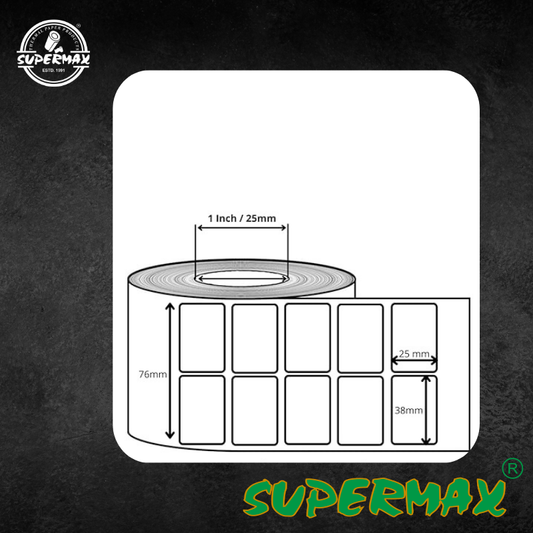 Supermax 38x25 Direct Thermal Barcode Label Sticker - 1.5 x 1 inch - 38mm x 25mm - 2 Ups - 1000 Labels Per Roll - White Self Adhesive sticker for Printing Barcoding (10 Roll Per Pack )